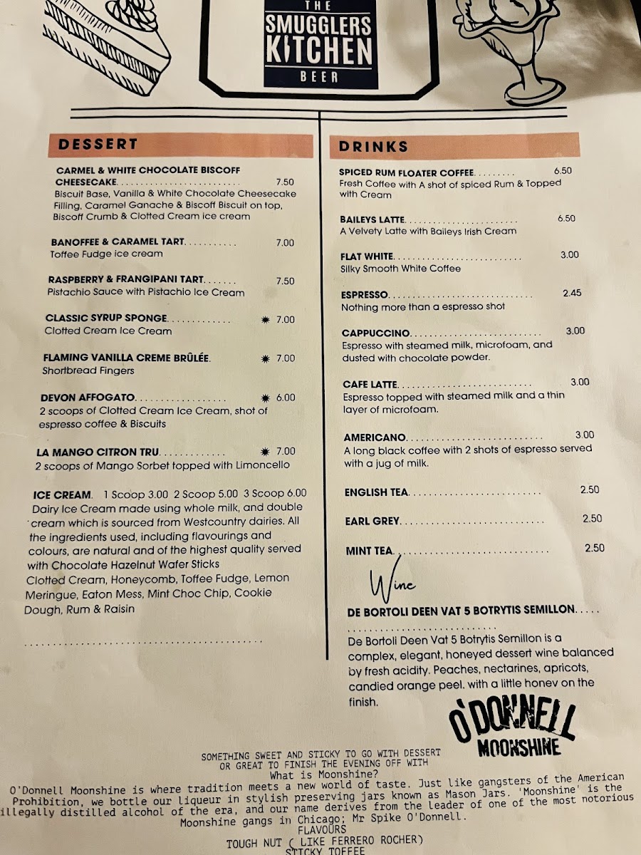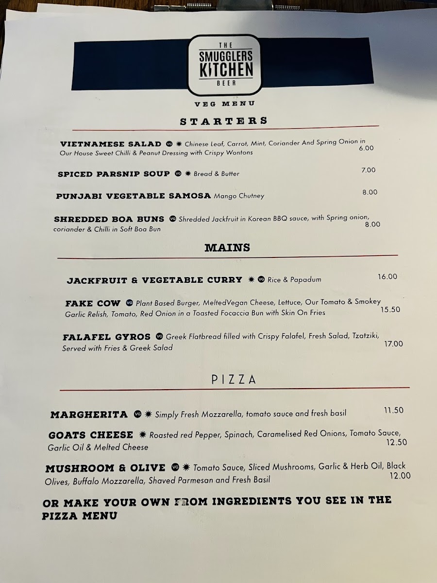 Overall, the menu at The Smugglers Kitchen offers a creative and satisfying plant-based selection that balances comfort with originality. The starters, such as the Vietnamese Salad, Spiced Parsnip Soup, Punjabi Vegetable Samosa, and Shredded Boa Buns, set a strong tone with fresh and globally inspired flavors. Moving into the mains, dishes like the Jackfruit & Vegetable Curry, Fake Cow, and Falafel Gyros showcase inventive takes on classic favorites, delivering both substance and character. The pizza options-Margherita, Goats Cheese, and Mushroom & Olive-provide familiar choices with a thoughtful twist, while the inclusion of De Bortoli Deen Vat 5 Botrytis Semillon adds a refined touch to the wine offering. To finish, desserts such as the Carmel & White Chocolate Biscoff Cheesecake, Banoffee & Caramel Tart, Raspberry & Frangipani Tart, Classic Syrup Sponge, and Flaming Vanilla Creme Brûlée round out the experience with indulgent sweetness. Altogether, the menu feels well-curated, diverse, and appealing for those seeking both comfort food and something a little different.